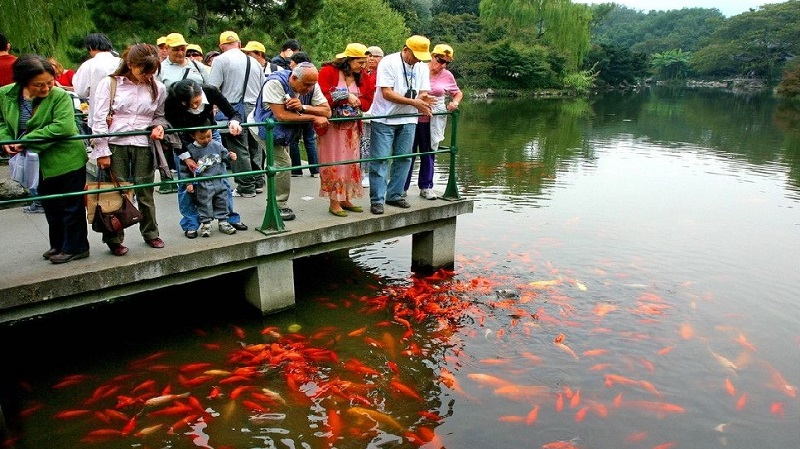 Điểm đặc sắc nhất của Hoa Cảng Quan Ngư chính là ao cá. Tại đây, hàng nghìn con cá đỏ, cá vàng tung tăng bơi lội. Du khách có thể trải nghiệm cảm giác thú vị khi rải thức ăn xuống mặt nước, ngắm đàn cá quẫy đuôi tạo nên những gợn sóng lấp lánh. Đây không chỉ là hoạt động giải trí mà còn mang lại cảm giác thư giãn, xua tan mệt mỏi.