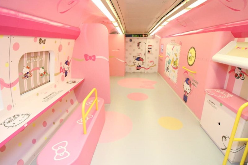Ngoài hàng ghế dành cho du khách, chuyến tàu còn có những khoang riêng biệt được phủ màu hồng trắng từ sàn lên đến nóc, tạo thành một studio thu nhỏ dễ thương, khiến các tín đồ Hello Kitty thích mê.